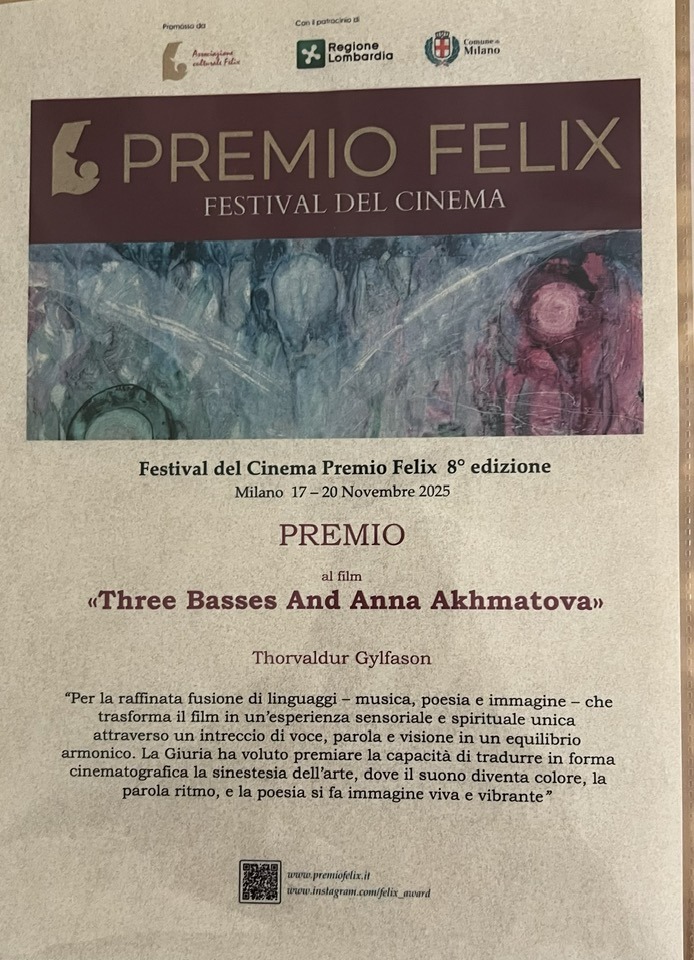 My latest project is Three Basses and Anna Akhmatova, a short film where three Icelandic bass singers of international renown, Bjarni Thor Kristinsson, Kristinn Sigmundsson, and Viðar Gunnarsson, perform three songs of mine set to Akhamatova´s poetry, translated into Icelandic by Regína Stefnisdóttir. The film was premiered on Axess TV in Sweden in October 2025, awarded first prize in the category of documentaries at the Premio Felix film festival in Milan in November 2025, and awaits its 2025 premiere on Icelandic State Television (RÚV).