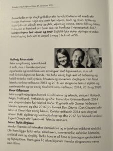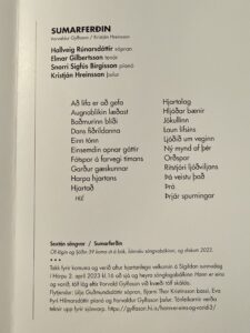 Hallveig Rúnarsdóttir sópran, Elmar Gilbertsson tenór og Snorri Sigfús Birgisson píanó frumfluttu Sumarferðina í Norðurljósum í Hörpu 27. nóvember 2022. Skáldið flutti stuttar skýringar á undan hverju lagi og ljóði sem var varpað á vegg á bak við sviðið.